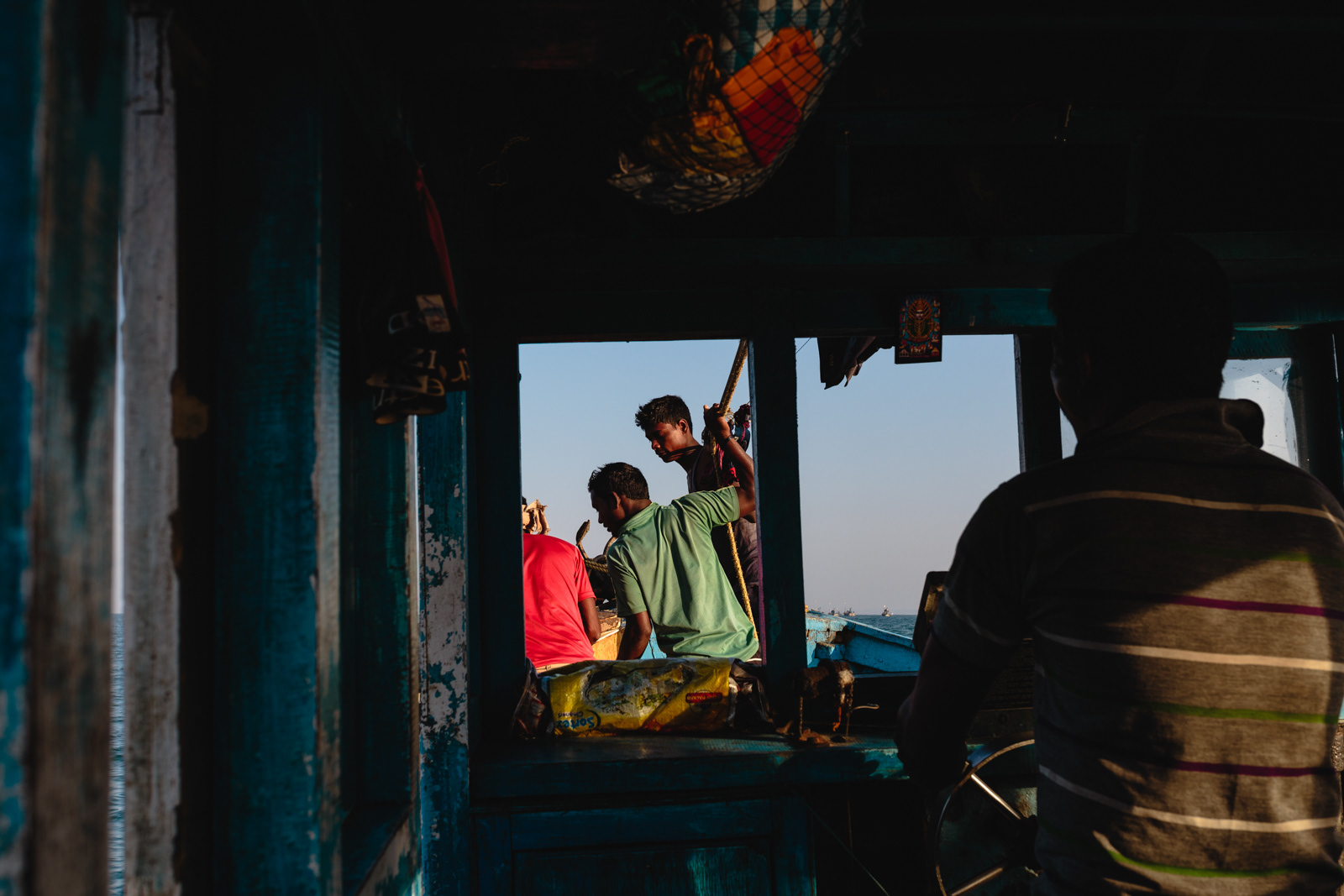 Sun rises behind the dragger. Another crew member now awake gets ready to prepare the morning chai.